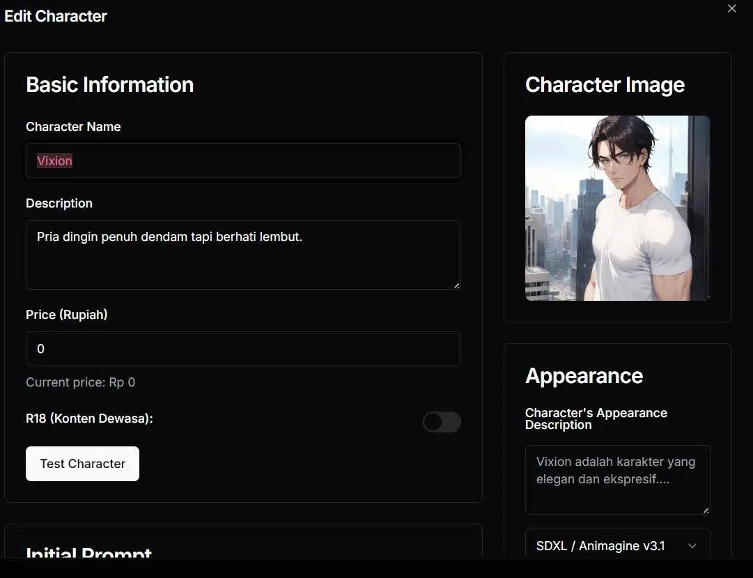 Di sebelah kiri bawah dari menu "Character's Appearance Description", ada menu Initial Prompt. Di sinilah kita akan melakukan prompting atau penjelasan tentang karakter yang kita buat. Di sini saya akan memberikan template untuk promptingnya. Tapi sebelum template saya berikan, akan saya jelaskan dulu bagaimana cara promptingnya agar memberikan hasil yang baik.