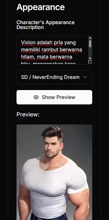 Setelah mengisi deskripsi, tekan tombol "Show Preview" di bawahnya. Maka akan dilakukan generate AI karakter sesuai yang Anda jelaskan.