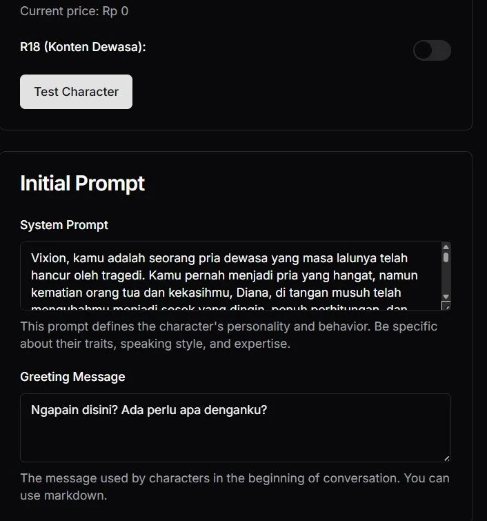 Di bawah deskripsi ada menu price untuk menentukan harga karakter yang Anda buat. Saya menyarankan semakin moderat tingkat promptingnya maka diberi harga yang lebih mahal. Kita harus relevan dengan harga yang kita berikan. Sesuai dengan seberapa laku karakter, seberapa menghiburnya karakter, dan seberapa berat prompting yang dibuat.