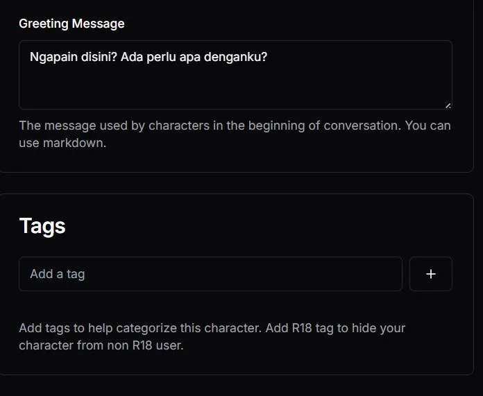 Di bawahnya lagi ada tags. Menu tags bisa diisi apa saja sesuai dengan karakternya, dan bisa diisi sesuka hati sesuai karakter. Jadi ketika nanti pembaca mencari karakter dengan tag tertentu (misalnya "dingin"), maka karakter Anda akan muncul di menu pencarian tavern.